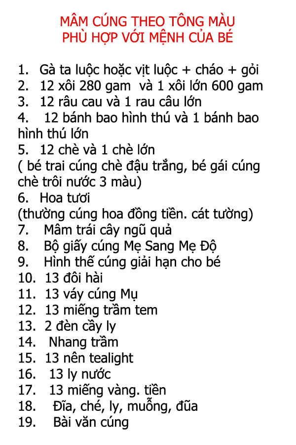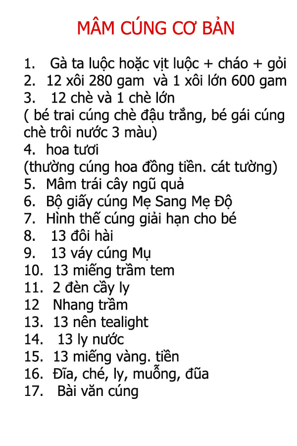 Lễ vật cúng đầy tháng cho bé trai, bé gái không khác nhau lắm giữa các vùng miền, bao gồm một mâm với nhiều vật phẩm gồm gà hay vịt luộc, cháo, gỏi, xôi, chè, ngũ quả, hoa, trầu cau, nhang đèn, giấy cúng, tam sên...Số lượng mỗi loại lễ vật thường 12 để bày tỏ lòng cảm tạ đến 12 bà Mụ. Mâm lễ vật được trình bày thật đẹp, cân xứng, hài hoà và khấn vái với tâm thành kính, khiêm nhường.